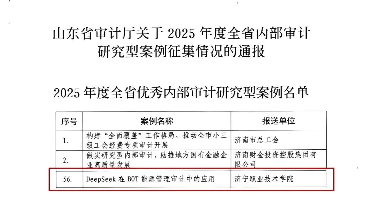 近日,山東省審計(jì)廳發(fā)布了《關(guān)于2025年度全省內(nèi)部審計(jì)研究型案例征集情況的通報(bào)》,我院審計(jì)室撰寫(xiě)申報(bào)的審計(jì)案例《Deepseek在BOT能源管理審計(jì)中的應(yīng)用》憑借創(chuàng)新性的實(shí)踐模式、扎實(shí)的研究成果及顯著的應(yīng)用成效,獲評(píng)2025年度全省優(yōu)秀內(nèi)部審計(jì)研究型案例。作為我院內(nèi)部審計(jì)工作的典型實(shí)踐,該案例聚焦能源管理這一學(xué)院內(nèi)部管理關(guān)鍵領(lǐng)域,以問(wèn)題為導(dǎo)向,運(yùn)用Deepseek技術(shù)、雙數(shù)學(xué)模型等創(chuàng)新審計(jì)方法,精準(zhǔn)識(shí)別風(fēng)險(xiǎn)點(diǎn)并提出可操作性改進(jìn)建議,...